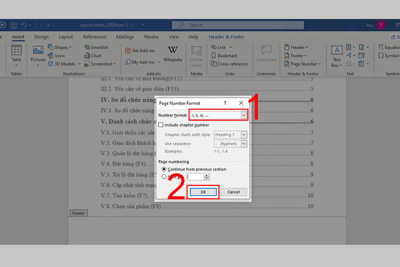 Bước 2: Sau đó, bạn hãy chọn tab Insert > Vào Page Number > Nhấn chọn Format Page Numbers. Tại phần Number Format, bạn lựa chọn định dạng là La Mã > Sau đó Click OK.